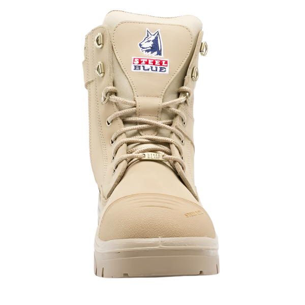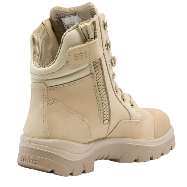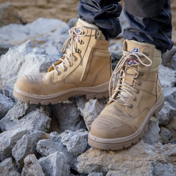 Steel Blue Southern Cross Zip 392661 Work Boot. The Southern Cross Zip S3 is a 150mm Ankle Boot with a scalloped, padded collar for ease of movement. Protective footwear made from premium Water Resistant leather. This safety boot features a 200J Steel Toe Cap and industrial grade zipper. You can tie your laces for the perfect fit and use the zipper for easy for on and off.